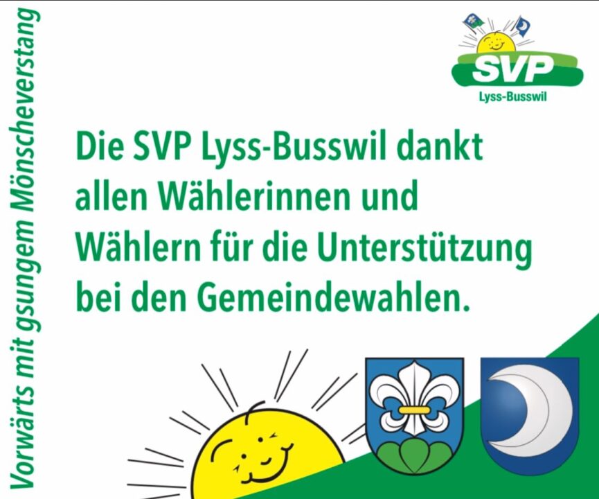 Die SVP Lyss-Busswil dankt allen Wählerinnen und Wählern für das Vertrauen. Gestärkt dürfen wir 2026 in die neue Legislatur starten und Ihre Anliegen noch kraftvoller vertreten.