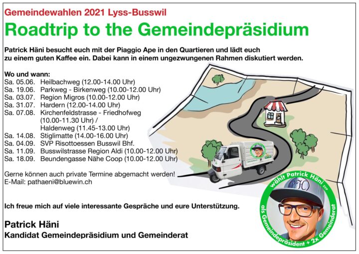 Nutzen sie einer der folgenden Termine um unsern GP/GR-Kandidat, Patrick Häni, kennenzulernen.